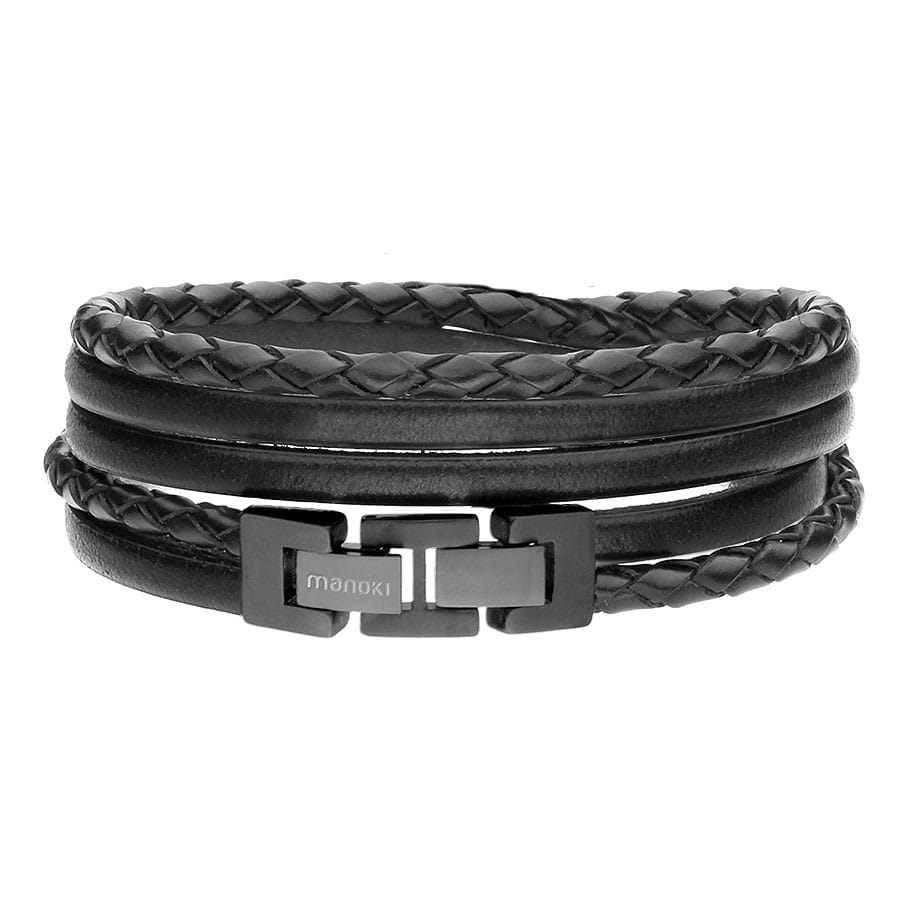 Została wykonana z czarnych naturalnych rzemieni oraz skórzanych pasków oplecionych dwukrotnie wokół nadgarstka. To doskonały akcent dla panów, pragnących wyrazić siebie poprzez biżuterię. Długość bransoletki wynosi 20 cm.