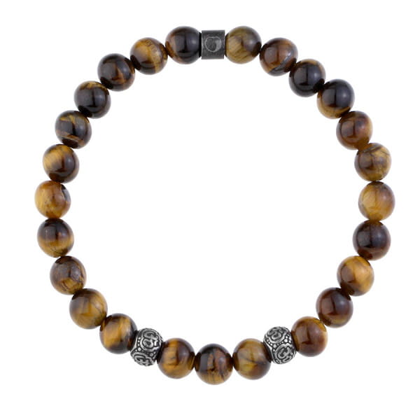 Kamień ten dodatkowo ma charakterystyczne cętki oraz ciemny pasek biegnący przez jego środek, co bardzo przypomina umaszczenie tygrysa. Jest on mieszanką brązowo-żółtych minerałów, a główną bazę stanowi limonit, kwarc oraz riebekit. Wyróżnia się jedwabistym wyglądem oraz dużą twardością (7 w skali Mosha). Dzięki temu tak często jest wykorzystywany do ozdabiania biżuterii oraz innych przedmiotów. Tygrysie oko ma piękny bursztynowy kolor. Jest złożony z mikroskopijnych kryształków kwarcu.