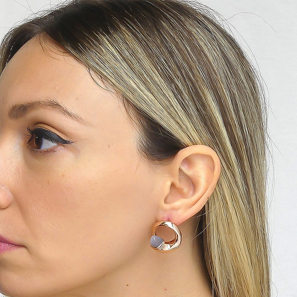 Pozłacane różowym złotem kolczyki w kształcie płatków ze spiralnym motywem z szarymi piramidalnymi kryształami w kolorze agatu na cyrkoniowej podstawie.