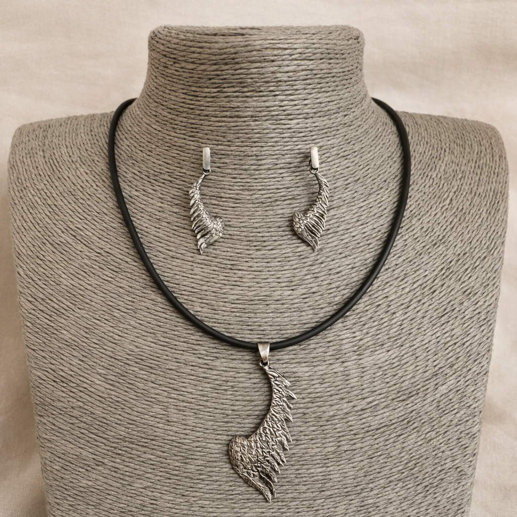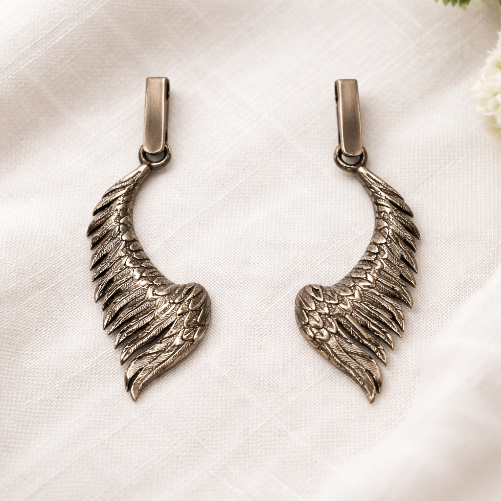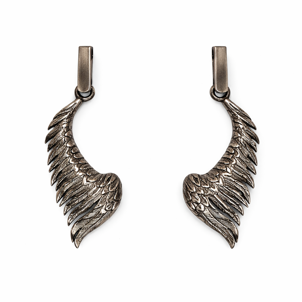 Srebrne kolczyki w formie stylizowanych skrzydeł, wykonane z oksydowanego srebra, przyciągają uwagę precyzyjnym odwzorowaniem detali i wyrazistą, dynamiczną formą. Każde skrzydło zostało starannie opracowane – widoczne warstwy piór i delikatne żłobienia nadają biżuterii głębi oraz realistycznego charakteru.