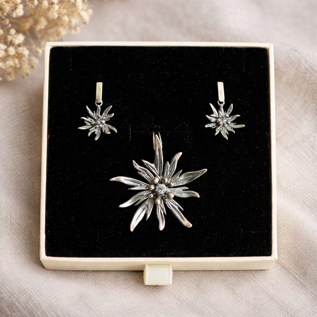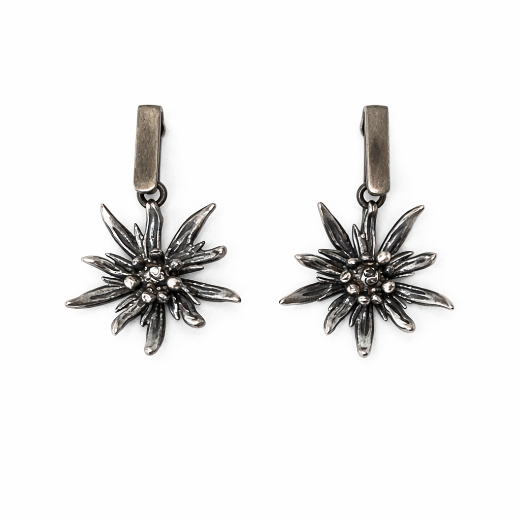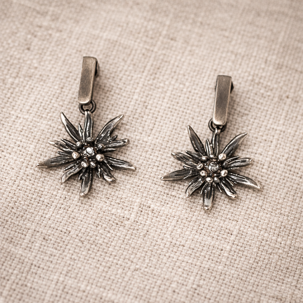 Srebrne kolczyki w formie stylizowanych kwiatów, wykonane z oksydowanego srebra, zachwycają wyrazistą formą i dopracowanym detalem. Ich przestrzenna konstrukcja oraz nieregularnie ułożone płatki nadają biżuterii lekkości i naturalnego charakteru, inspirowanego górską roślinnością.