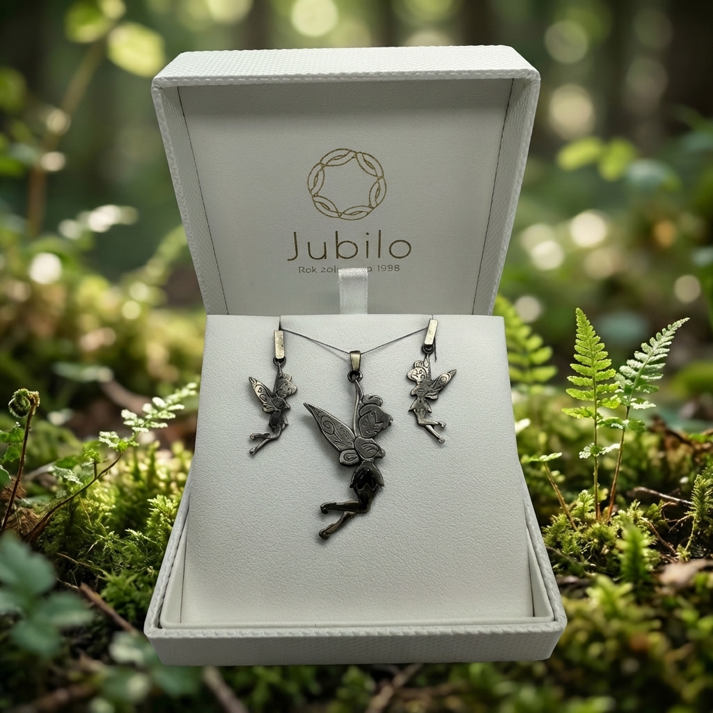 Do kompletu dostępna jest zawieszka z motywem Dzwoneczka, co pozwala stworzyć spójny, efektowny zestaw biżuterii.