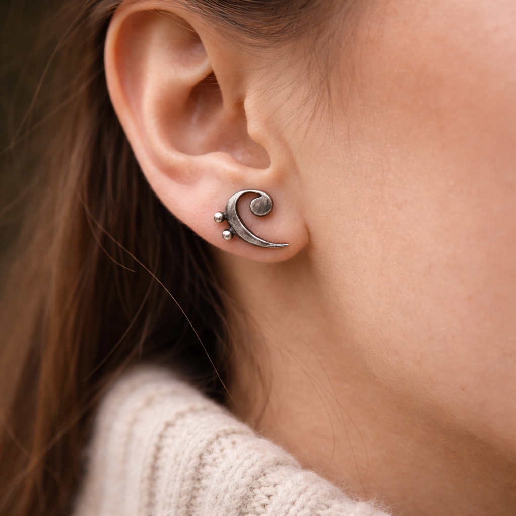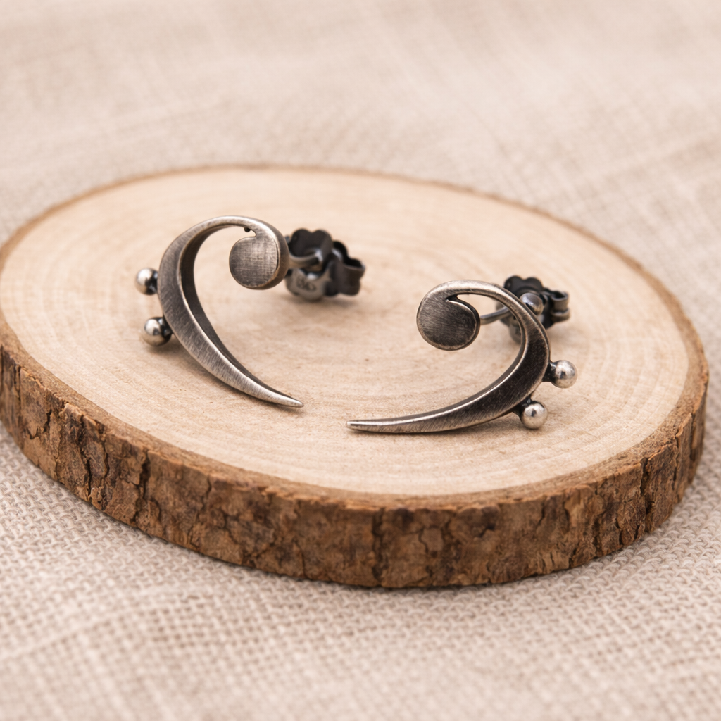 Subtelna forma inspirowana światem muzyki, zamknięta w eleganckiej, rzeźbiarskiej linii. Kolczyki w kształcie klucza basowego przyciągają uwagę płynnym, organicznym kształtem i wyraźnym kontrastem między przyciemnioną oksydą a delikatnym połyskiem srebra.