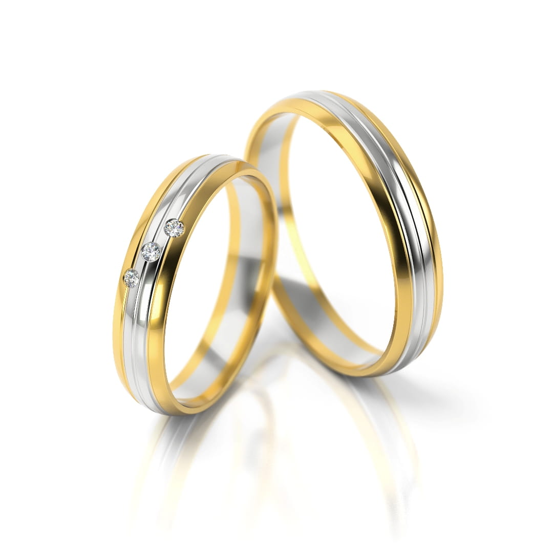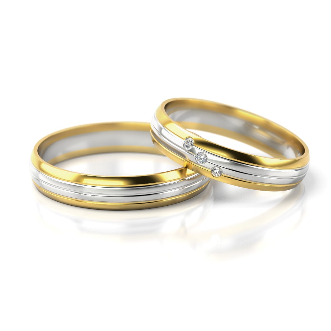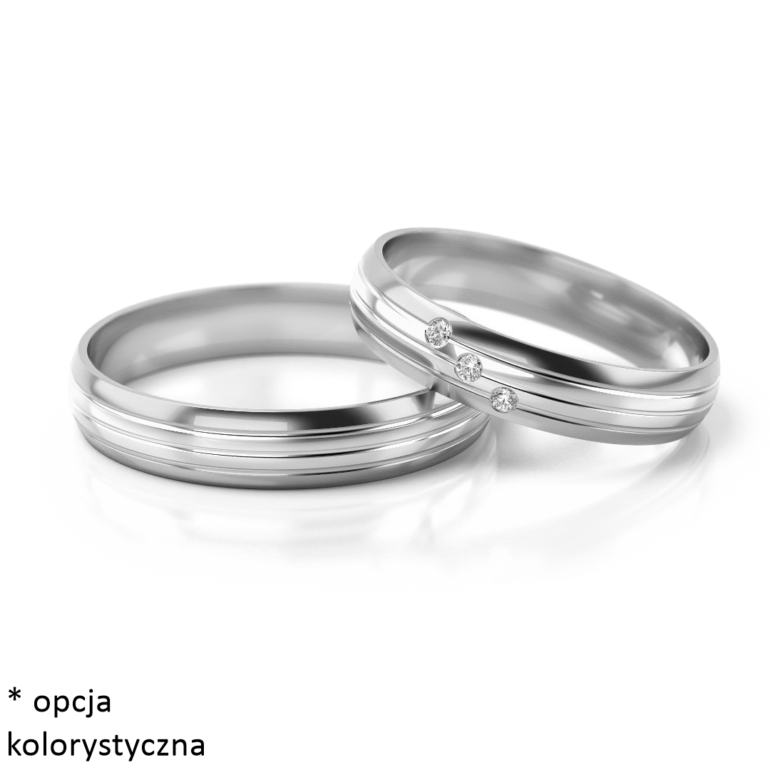 Model 238 od renomowanej marki Stelmach to połączenie klasyki i nowoczesności. Obrączki o profilu delikatnie półokrągłym, a ich powierzchnię zdobią trzy precyzyjnie grawerowane linie wzdłuż obrączki, które nadają kompozycji eleganckiej głębi i lekko technicznego stylu. Damska obrączka ozdobiona jest trzema kamieniami ułożonymi diagonalnie. Męska wersja obrączki utrzymana jest w klasycznej, gładkiej formie – bez kamieni, ale z tym samym geometrycznym wzorem.