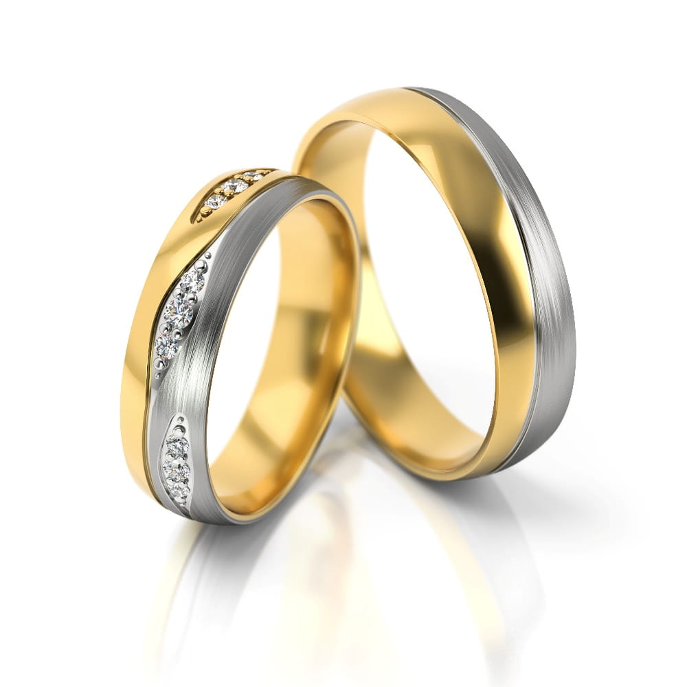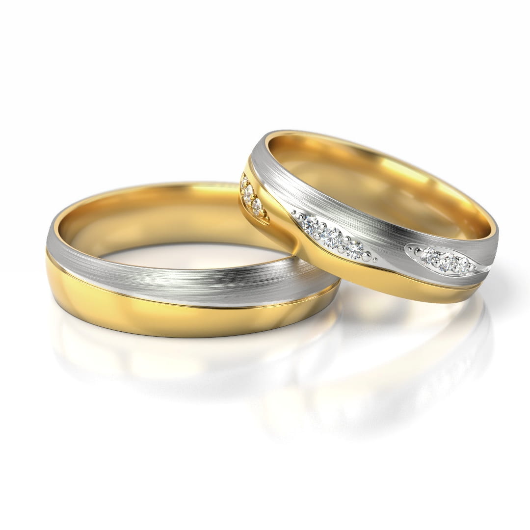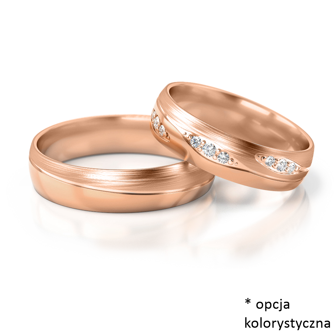 Obrączki o profilu lekko zaokrąglonym. Obrączka damska może być ozdobiona kamieniami. Do wyboru cyrkonie lub brylanty