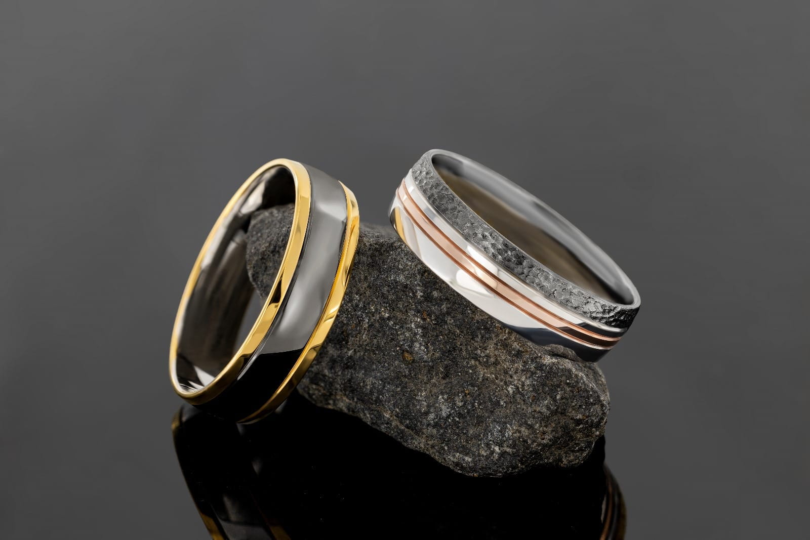 - Rutenowanie: to proces pokrywania powierzchni obrączek cienką warstwą czarnego rutenu. Dzięki temu powierzchnia zyskuje elegancką grafitową barwę, przechodzącą w ciemną szarość, tworząc efekt „czarnego złota”. Rutenowaniem można pokryć każdy kolor złota, jednak w zależności od początkowego koloru i wykończenia, mogą wystąpić subtelne różnice w odcieniach czerni.