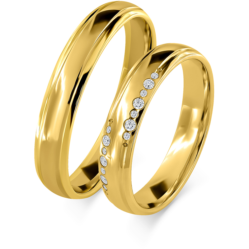 Złote obrączki o delikatnie zaokrąglonym profilu łączą klasykę z subtelnym, romantycznym detalem. Model wyposażony jest w precyzyjnie wykonane nacięcia po obu stronach obwodu, które stanowią bazę pod klasyczną oprawę kamieni. Do dyspozycji cyrkonie; diamenty laboratoryjne lub diamenty naturalne.