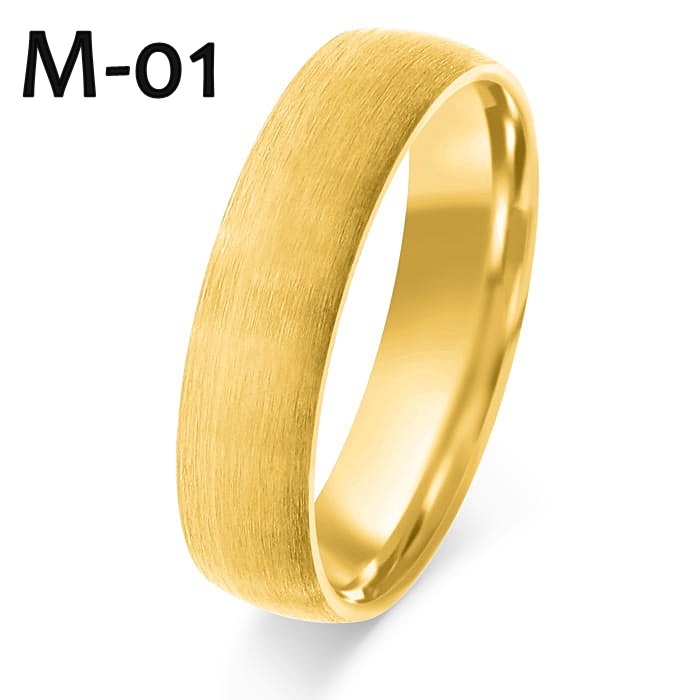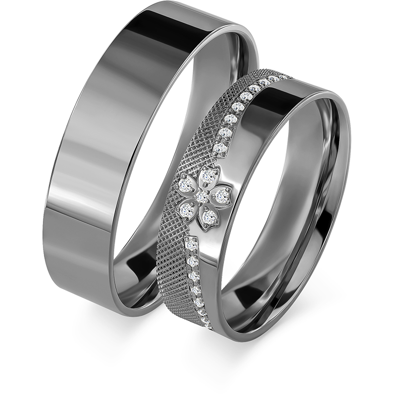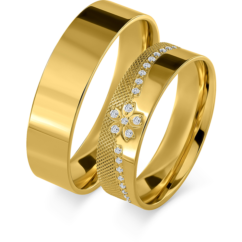 Złote obrączki o płaskim profilu. Obrączka męska posiada gładką, minimalistyczną powierzchnię, dzięki czemu doskonale wpisuje się w klasyczne i nowoczesne trendy. Obrączka damska wyróżnia się dekoracyjnym wzorem – ukośną kratką, która nadaje jej unikalnej struktury, oraz centralnym motywem kwiatowym podkreślającym subtelny i romantyczny charakter biżuterii. Dodatkowym atutem jest możliwość oprawy kamieni w obrączce damskiej, co pozwala nadać jej jeszcze bardziej wyjątkowego wyglądu. Do dyspozycji cyrkonie; diamenty laboratoryjne lub diamenty naturalne. Model dostępny jest w różnych wariantach metalu — złocie (żółtym, białym i różowym), w różnych próbach złota (np. 333, 375, 585), a także w srebrze próby 925. Dzięki temu można dopasować biżuterię do indywidualnych preferencji i budżetu.