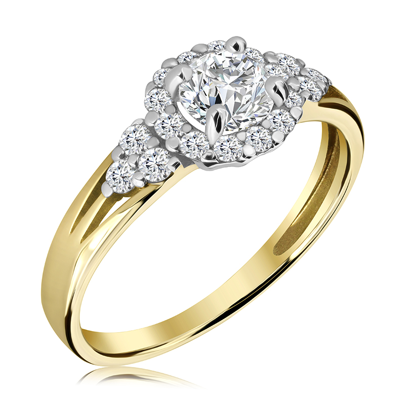 Kamień: diamenty naturalne H/SI 1 x 5 mm + 6 x 1,8 mm + 12 x 1,5 mm; diamenty laboratoryjne F/VS o łącznej masie 0,87ct