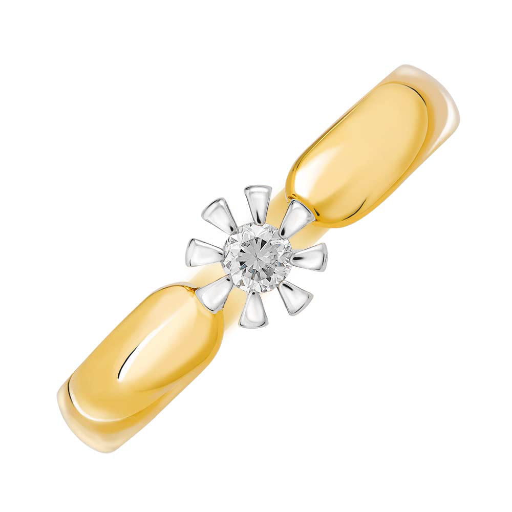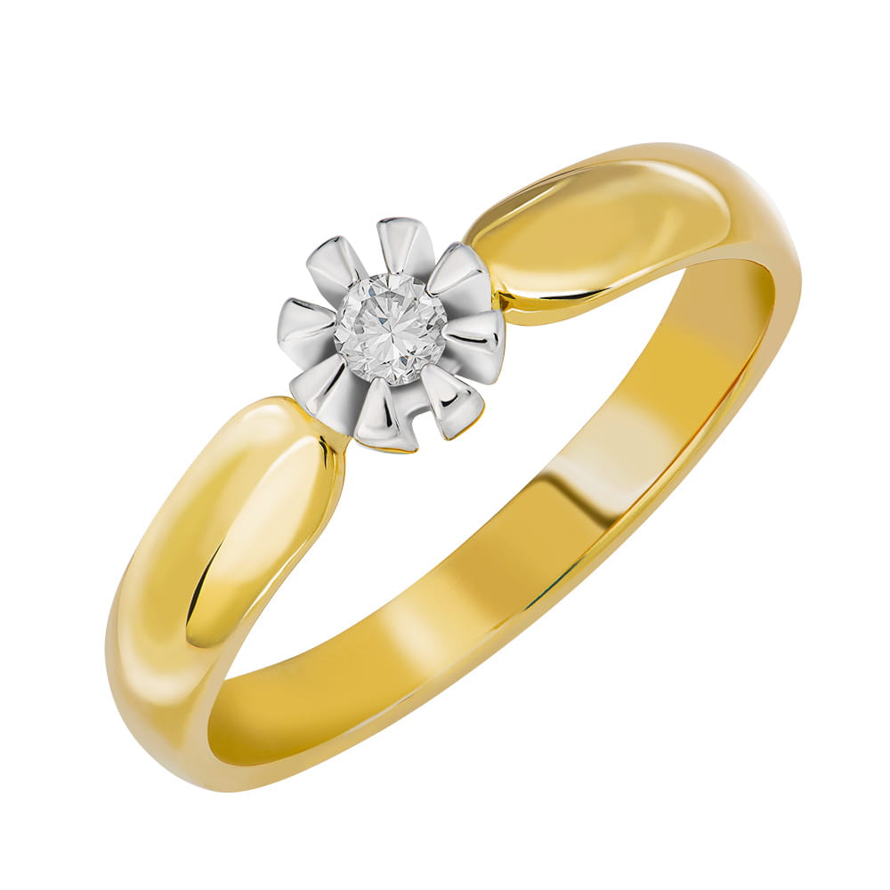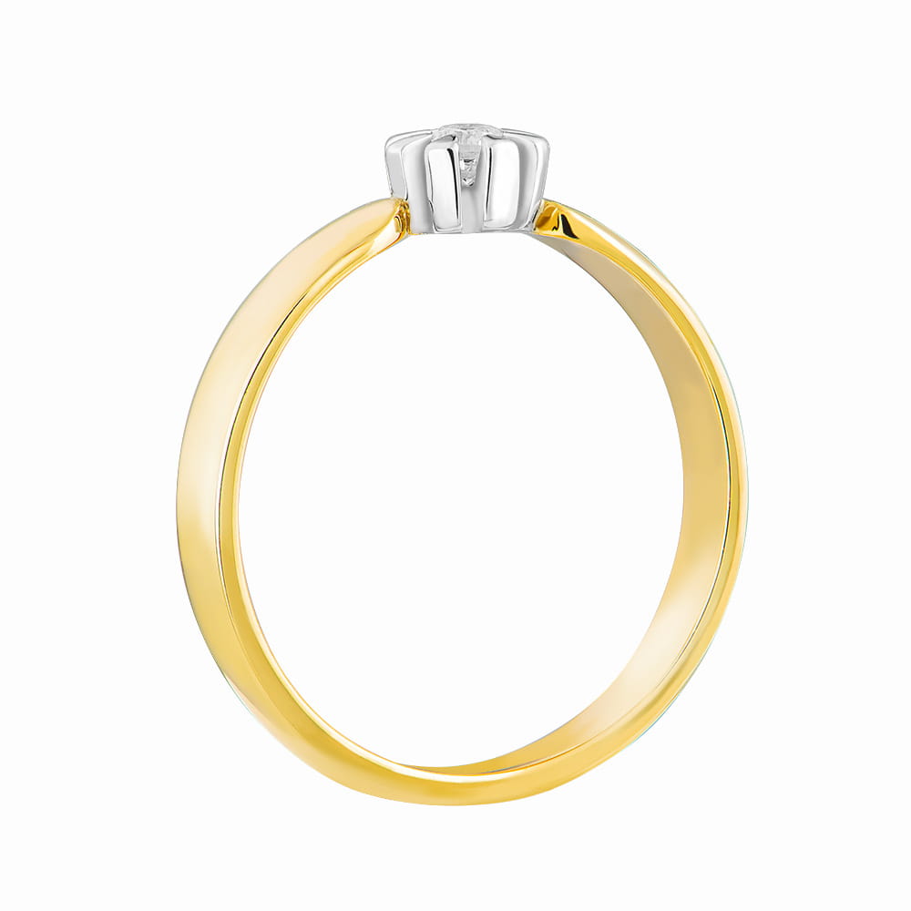Klasyczny pierścionek zaręczynowy ozdobiony diamentem o szlifie brylantowym, znajdującym się w centralnym punkcie. Jego masa wynosi 0,09 ct. Szynę wykonano z 14-karatowego żółtego złota o próbie 585, zaś górkę z białego złota o tej samej próbie.