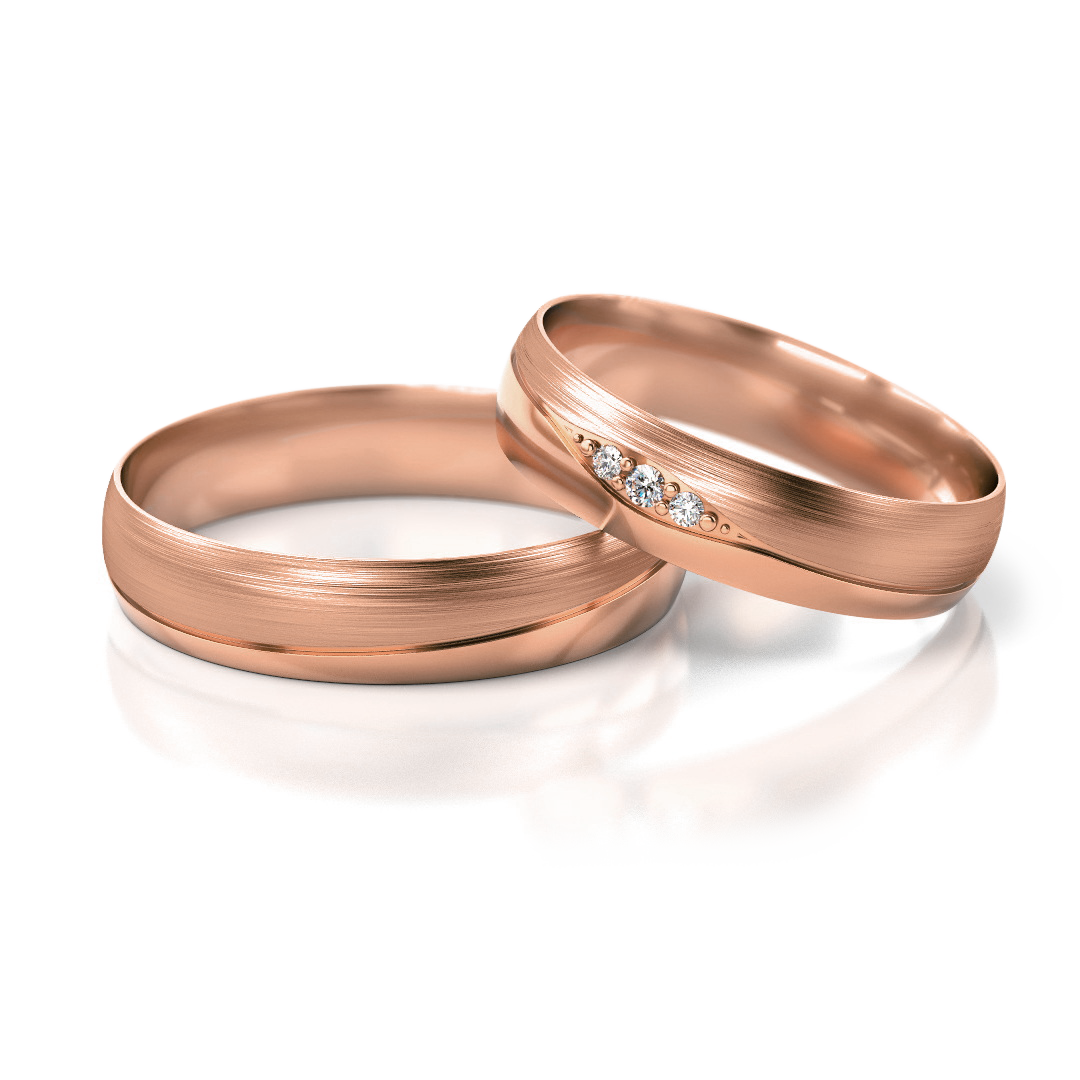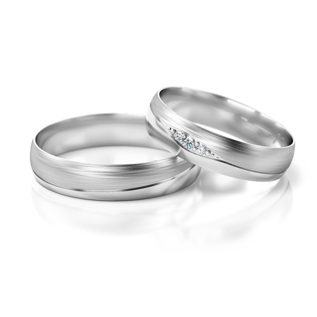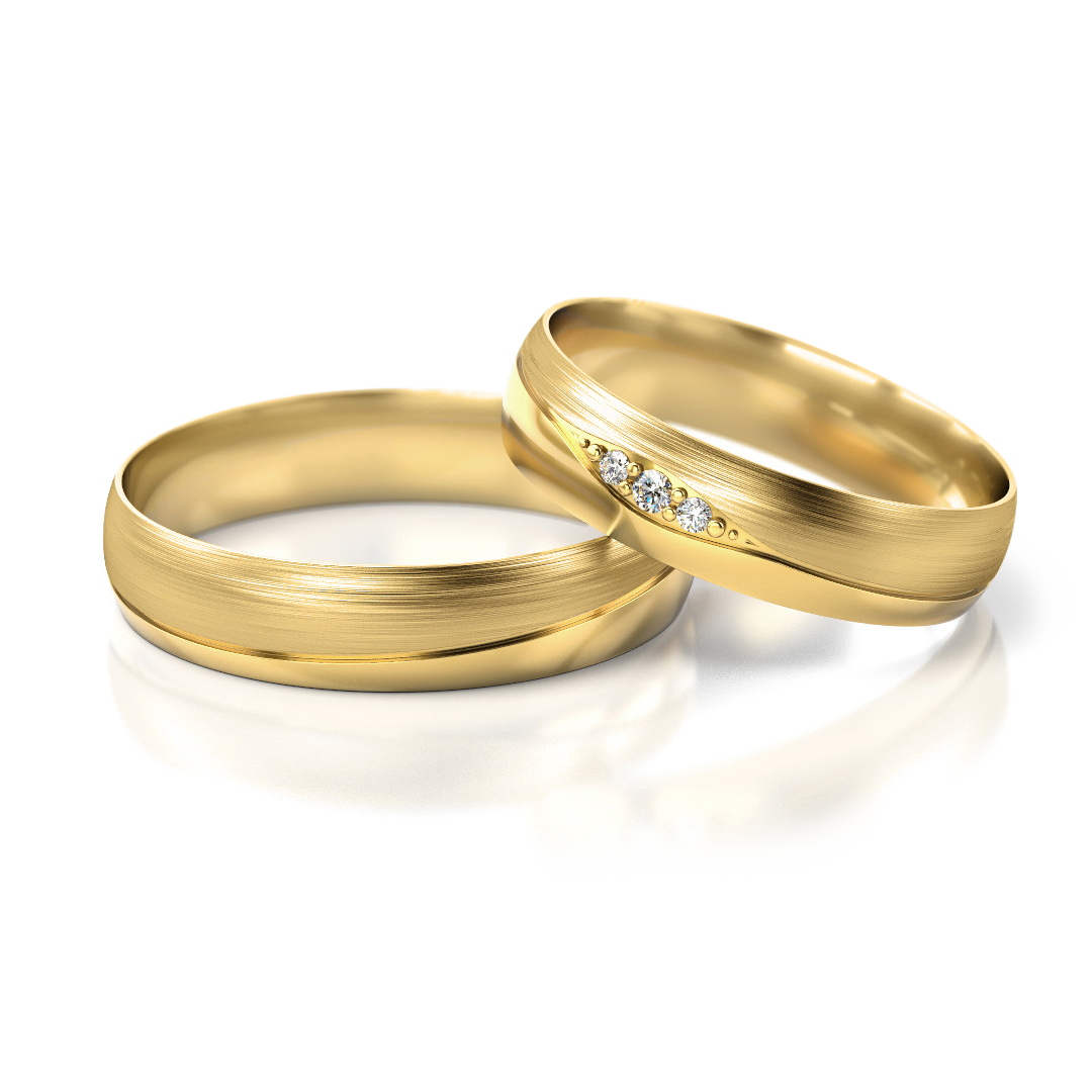 Obrączki o profilu lekko zaokrąglonym. Obrączki zostały ozdobione nacięciem w kształcie fali po obwodzie. Obrączka damska ozdobiona została kamieniami.