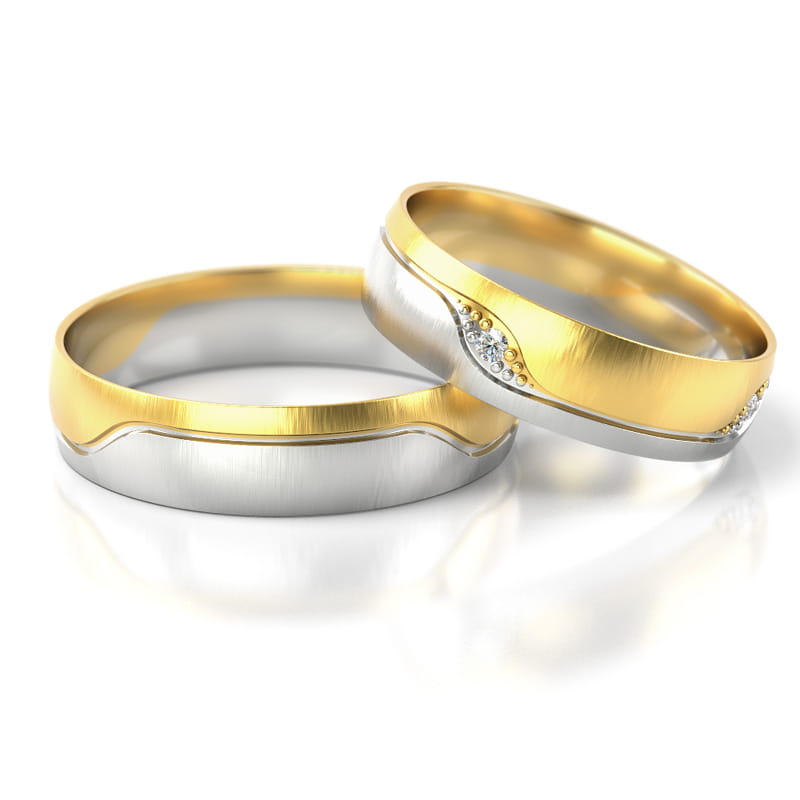 Obrączki o profilu lekko zaokrąglonym. Obie części zostały oddzielone delikatnym rowkiem, dodatkowo damska może być ozdobiona czterema kamieniami oprawionymi symetrycznie po obwodzie. Do wyboru cyrkonie lub brylanty
