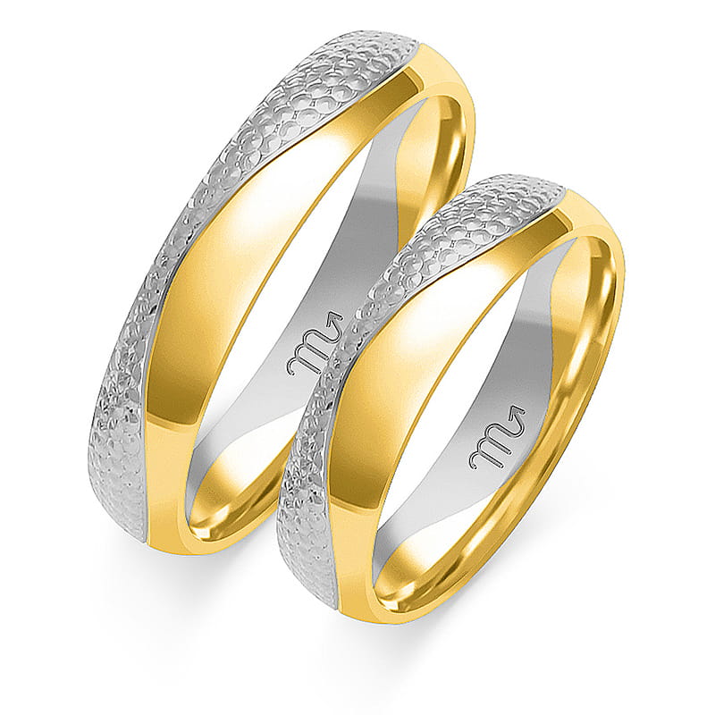 Prezentowane obrączki o profilu lekko zaokrąglonym. Obrączki ozdobiono nacięciami w kształcie fali. Jedna część ozdobiona ciekawym diamentowanym grawerem.