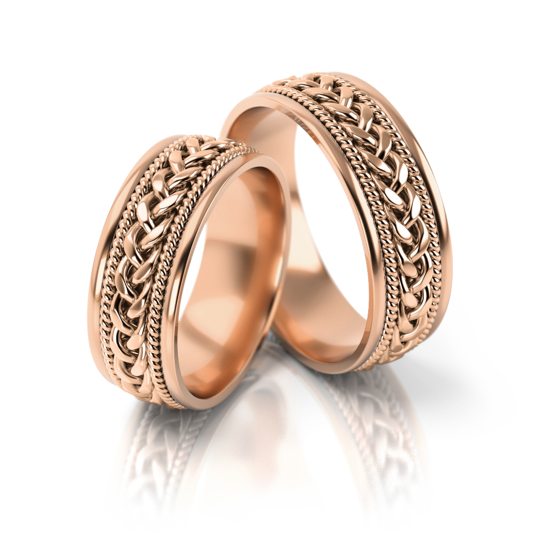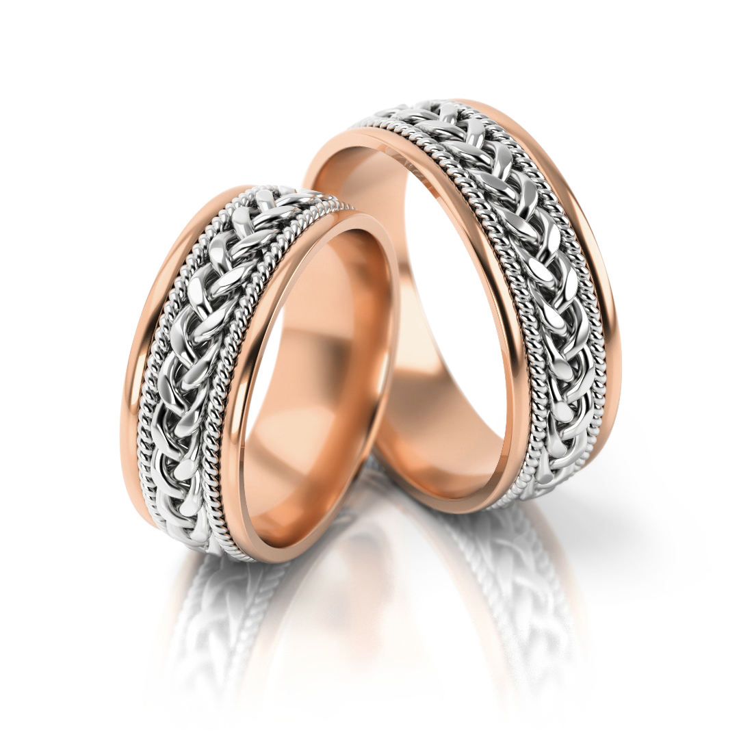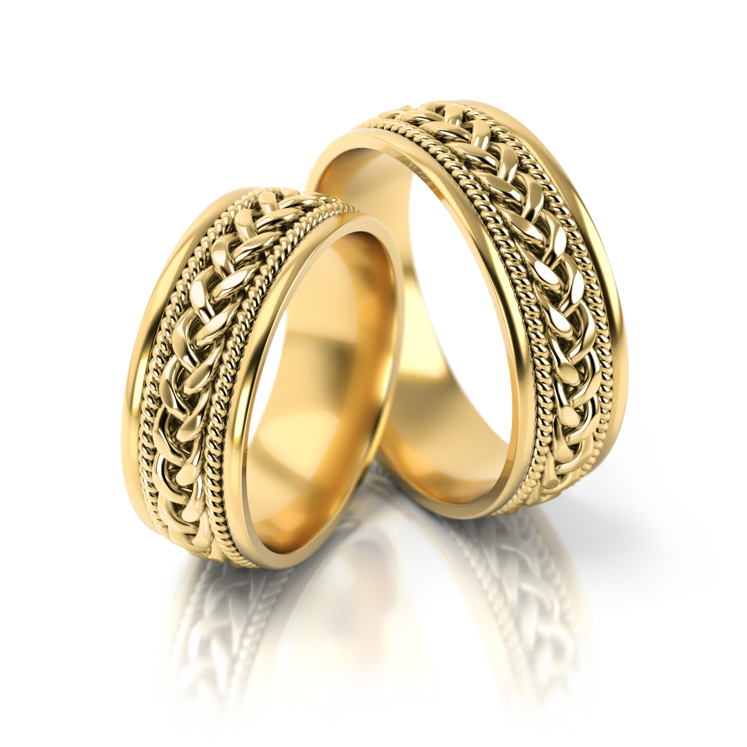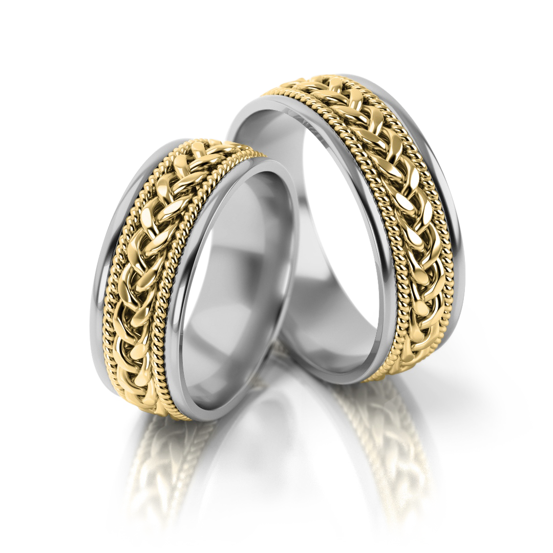 Ekskluzywne złote obrączki ślubne o wyjątkowym charakterze i stylistyce. Model urzeka niezwykłym ręcznie plecionym warkoczem.
