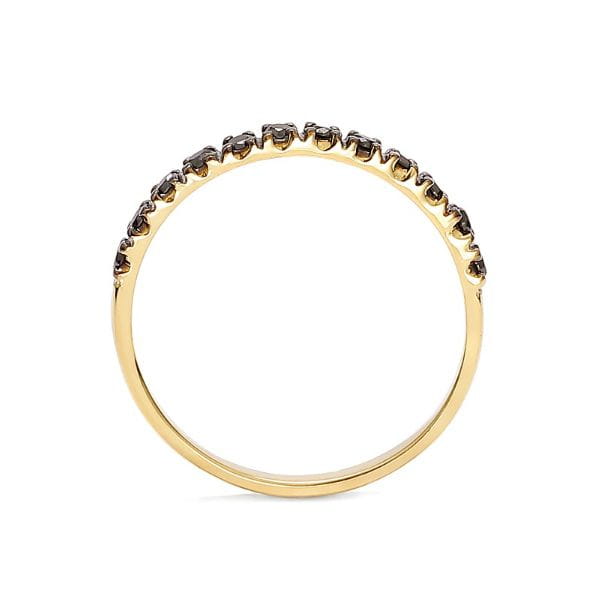 Subtelna elegancja, a jednocześnie modny element biżuterii wyróżniają ten pierścionek-obrączkę. 12 sztuk żywo błyszczących czarnych diamentów oprawionych w żółtym złocie. Pierścionki z czarnymi diamentami to biżuteria, która idealnie łączy klasykę i elegancję.