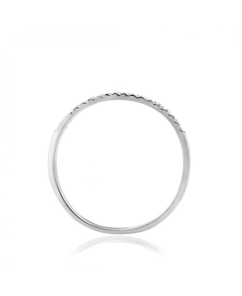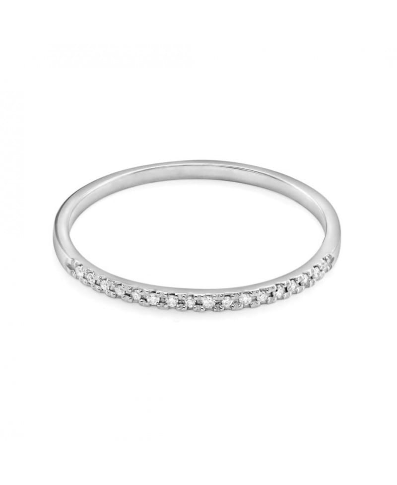 Subtelna elegancja, a jednocześnie modny element biżuterii wyróżniają ten pierścionek-obrączkę. 17 sztuk żywo błyszczących kamieni oprawionych w białym złocie.