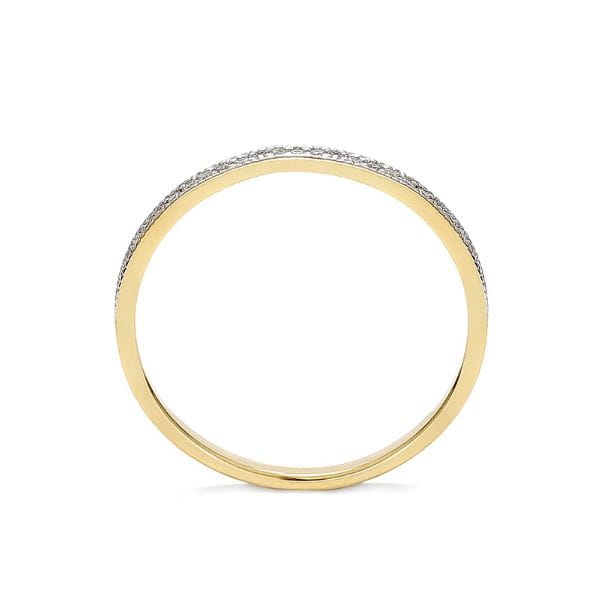 Subtelna elegancja, a jednocześnie modny element biżuterii wyróżniają ten pierścionek-obrączkę. 30 sztuk żywo błyszczących brylantów oprawionych w żółtym złocie. Noś go jako pojedynczy pierścionek lub łącz z innym kolorem i złotą obrączką. Istnieje możliwość zamówienia w innym kolorze złota (białe, różowe) i oprawy czarnych diamentów.